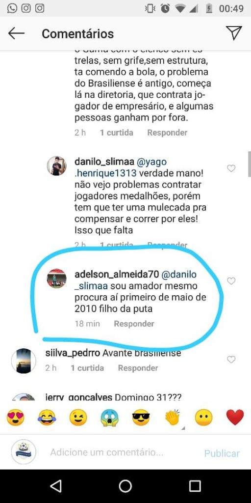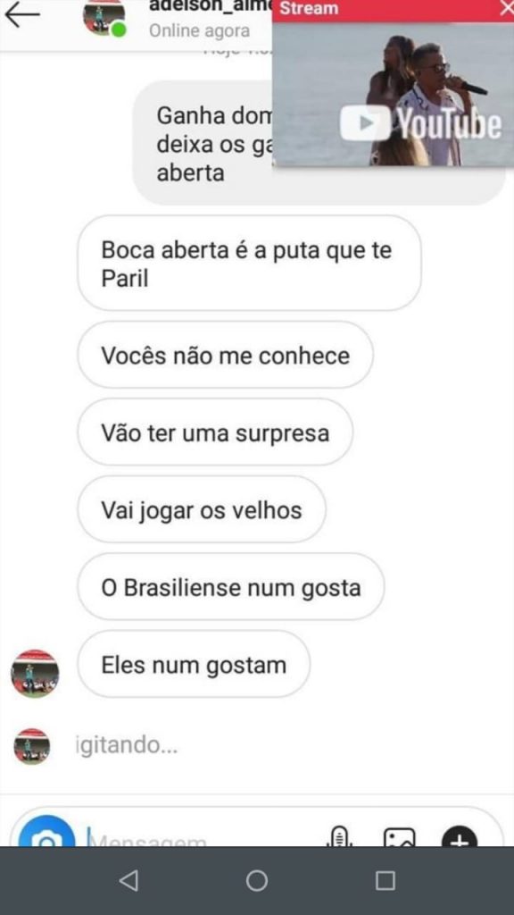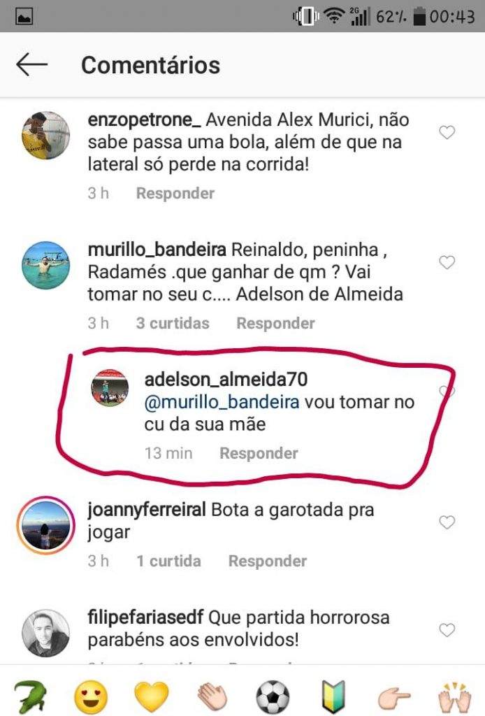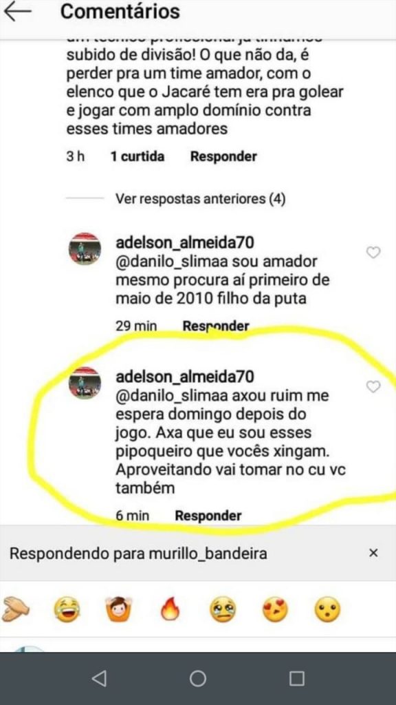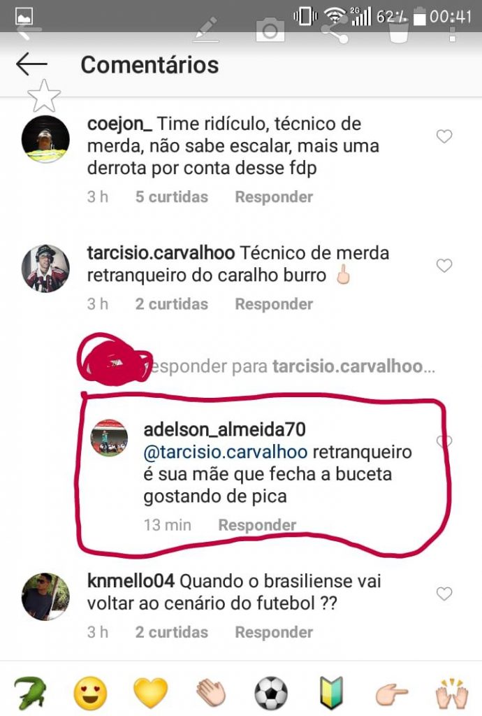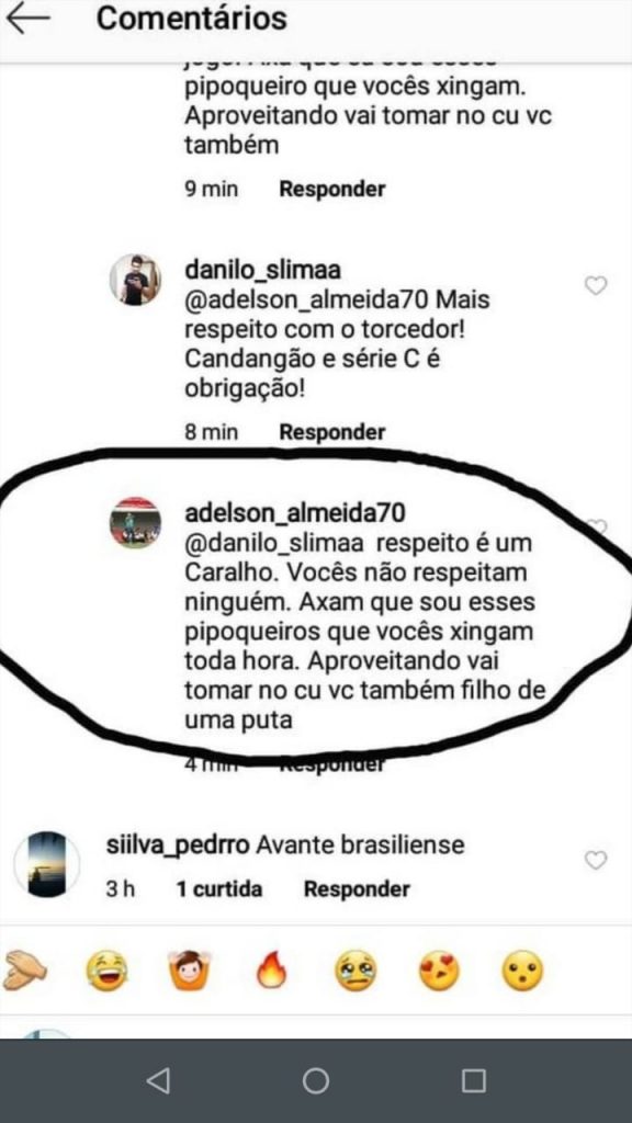 E o palavreado não foi nada ameno, não. Em uma das respostas, Adelson diz: “vou tomar no c* da sua mãe”. Em outro comentário, o treinador respondeu: “respeito é um car****. Vocês não respeitam ninguém. […] Aproveitando, vai tomar no c* vc também, filho de uma put*”.