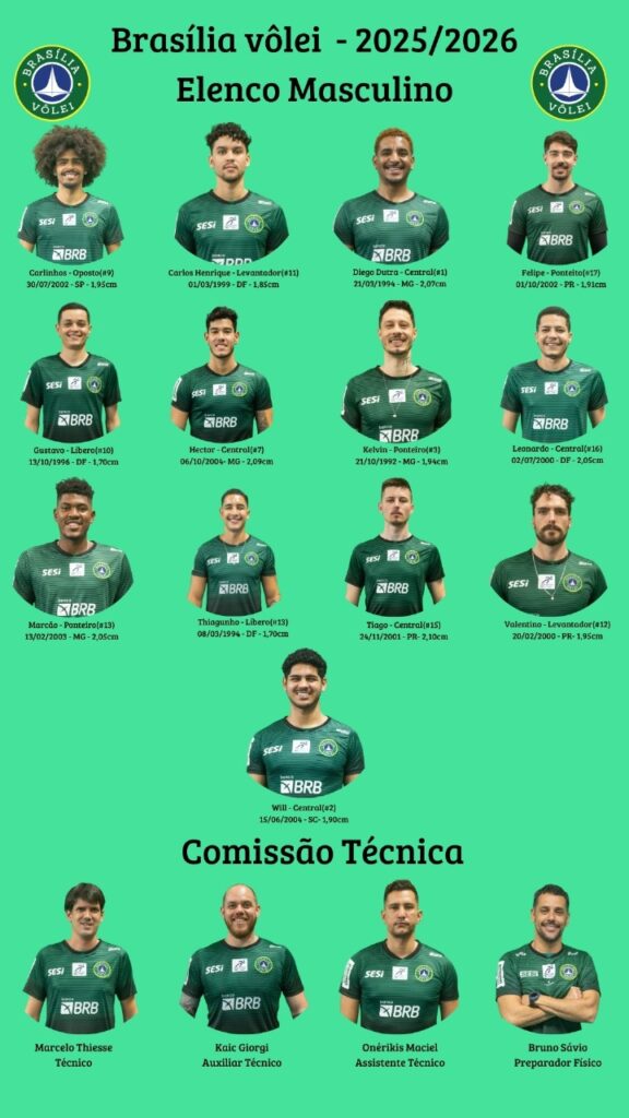 Neste sábado (29/11), o Brasília Vôlei enfrentará mais uma estreia na Superliga B Masculina, ao encarar o Fluminense às 17h no Ginásio Sesi Taguatinga. Em mais uma temporada de Marcelo Thiessen como treinador, o objetivo da equipe mais uma vez é o acesso à Superliga A. O time está na segunda divisão nacional desde a temporada 2022/23, quando venceu três partidas e ficou à frente apenas do Rede CUCA. O ponteiro Kelvin está de volta ao time, enquanto Valentino Abreu (levantador) e Diego Dutra (central, na foto de capa) seguem em Brasília. O segundo é figurinha carimbada, já que defende o clube desde a temporada 20/21.